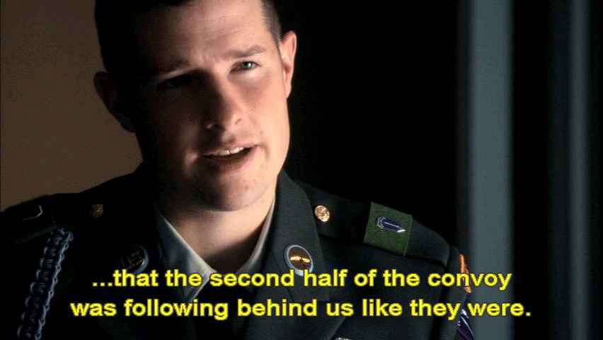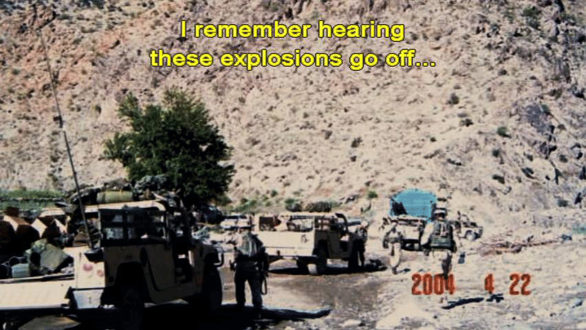 Let's figure out where we're at. Let's figure out where Serial 2's at." And that's when we heard the first initial explosion. [Pfc. Bryan O'Neal, 2/75 Ranger Battalion] I remember hearing these explosions go off ... ... and I knew they were in the back of the canyon where we just were. Which kind of surprised me because, you know, I didn't realize ... ... that the second half of the convoy was following behind us like they were. |