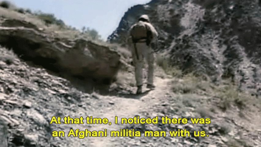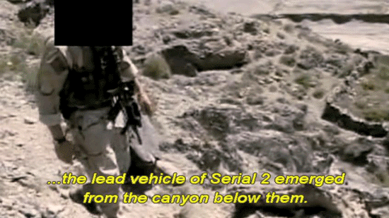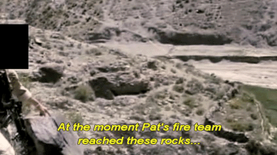 [Pfc. Bryan O'Neal, 2/75 Ranger Battalion] At that time, I noticed there was an Afghani militia man with us. He jumped in with us and we just started running. [Narrator] At the moment Pat's fire team reached these rocks ... ... the lead vehicle of Serial 2 emerged from the canyon below them. The vehicle had left Kevin, Jason and the rest of the convoy behind. |