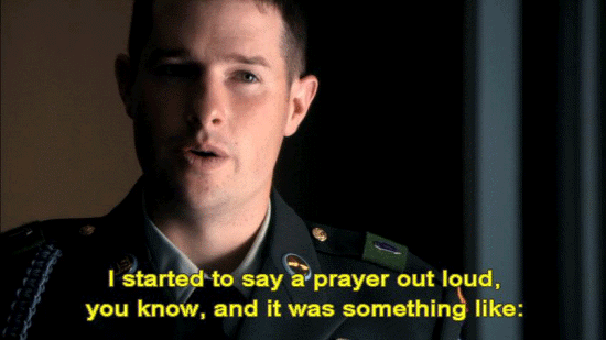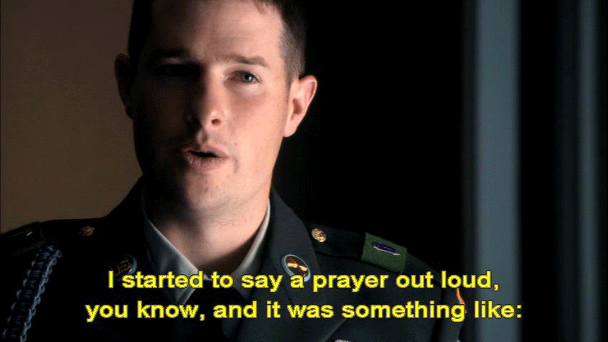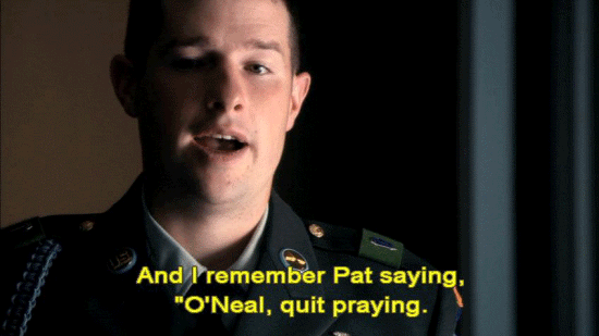 ... but knowing that they're gonna kill us and kill everybody. And I was, you know, a second away from just loading them up ... ... just killing them all, and I could have done it. [Pfc. Bryan O'Neal, 2/75 Ranger Battalion] I started to say a prayer out loud, you know, and it was something like: "Oh, God, please, if you can help us out of this situation ... ... you know, I'll be very grateful ... ... and I'll do what I can to repay you for this debt that I will owe you." And I remember Pat saying, "O'Neal, quit praying. |