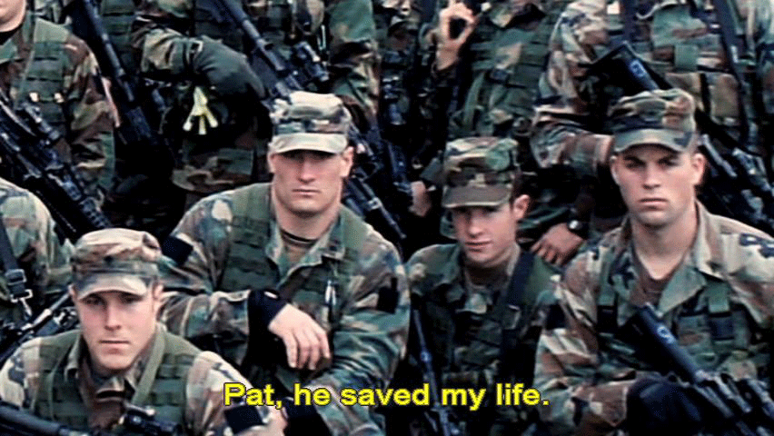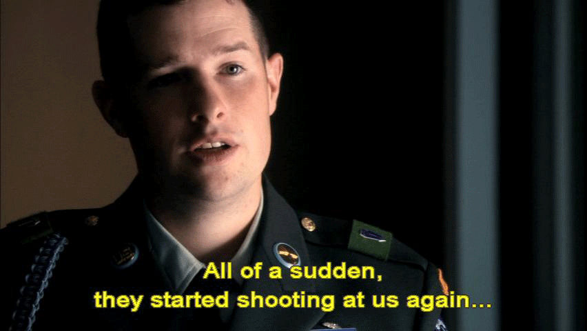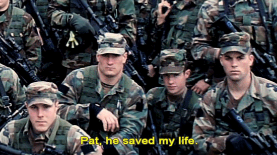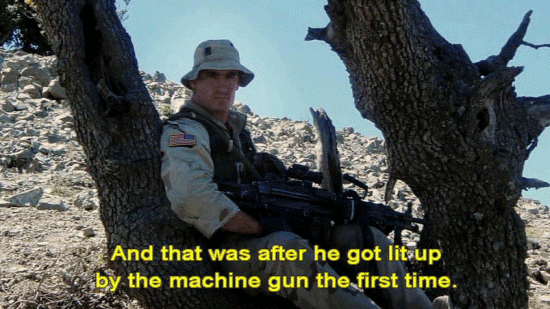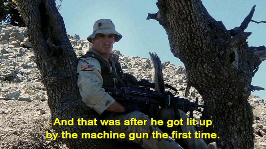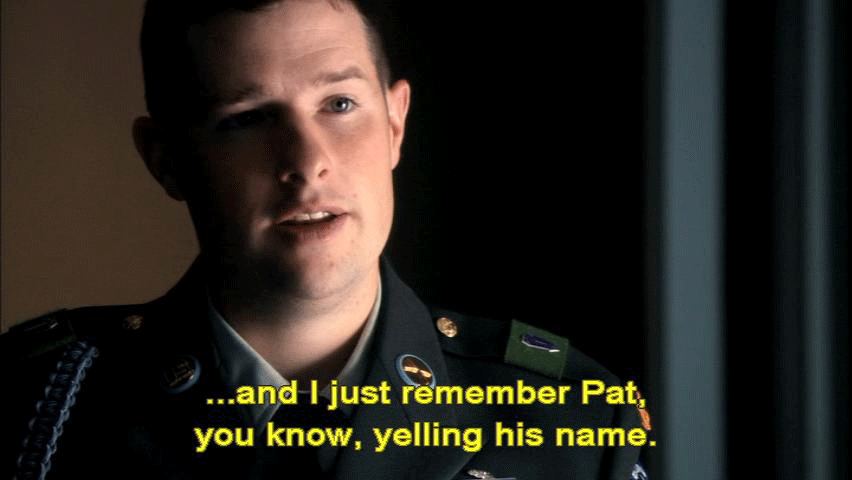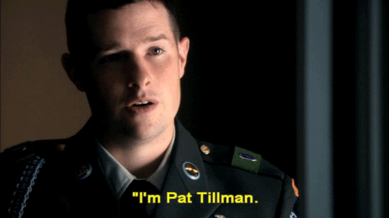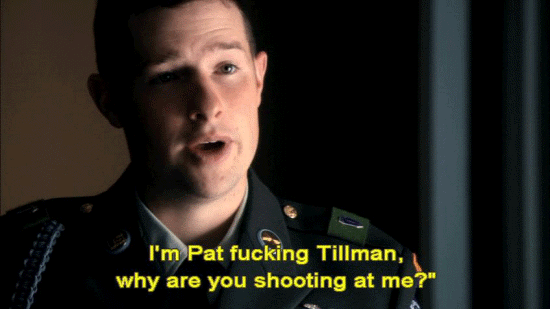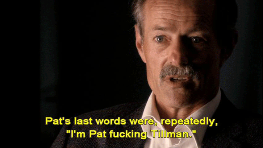 Pat, he saved my life. All of a sudden, they started shooting at us again ... ... and I just remember Pat, you know, yelling his name. "I'm Pat Tillman. I'm Pat fucking Tillman, why are you shooting at me?" [Patrick Tillman Sr., Pat's father] Pat's last words were, repeatedly, "I'm Pat fucking Tillman." And that was after he got lit up by the machine gun the first time. |