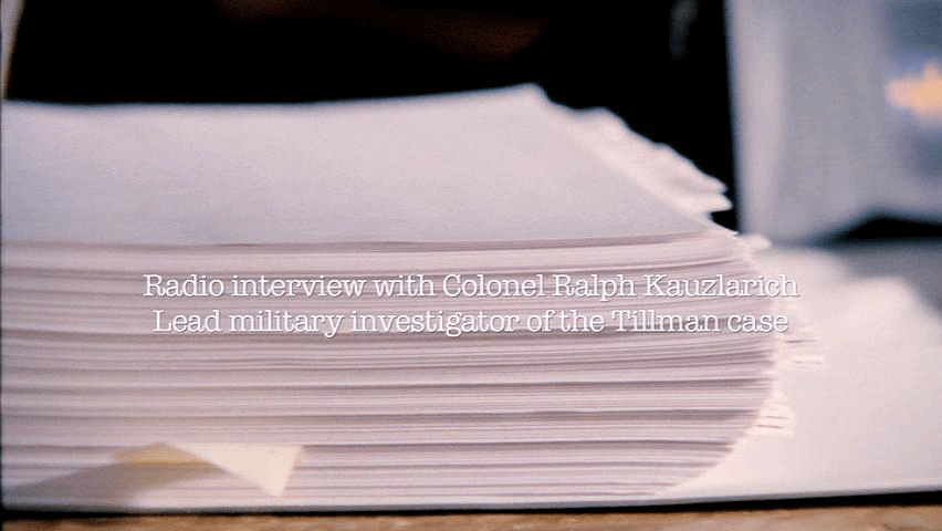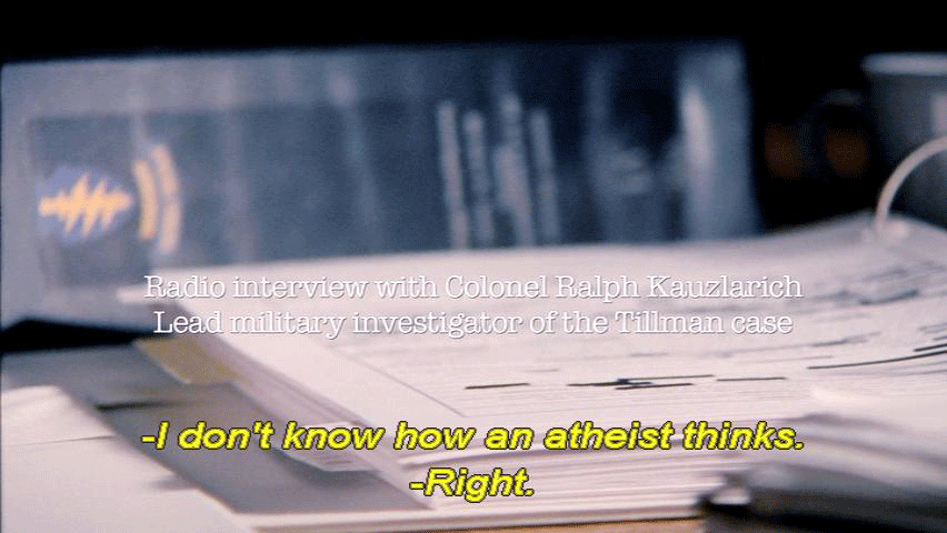 ... the lead investigator assigned to their case ... ... began publicly suggesting that it was time to move on. [Radio interview with Colonel Ralph Kauzlarich, Lead Military investigator of the Tillman case] I don't know. These people, they have a hard time letting it go. It may be because of their religious beliefs. I don't know how an atheist thinks. [Radio Person] Right. [Radio interview with Colonel Ralph Kauzlarich, Lead Military investigator of the Tillman case] But I can only imagine that, that would be pretty tough. [Radio Person] Right. |