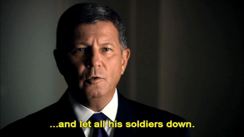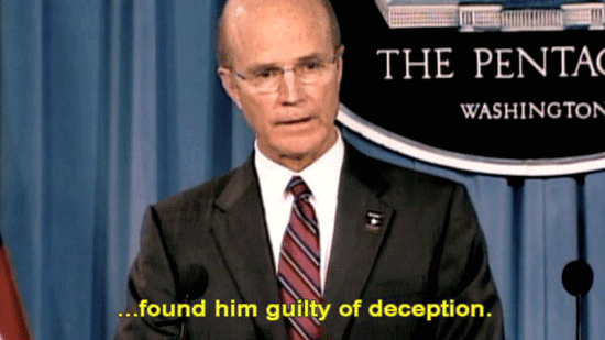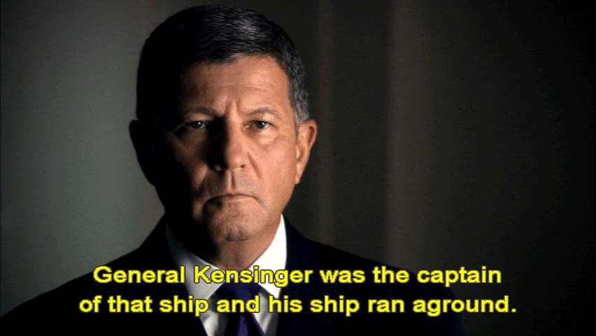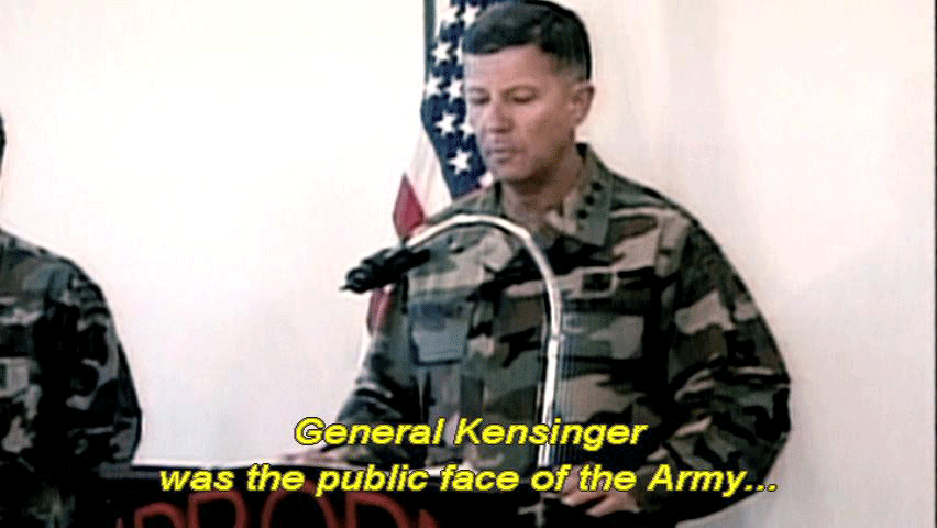 ... found him guilty of deception. General Kensinger was the captain of that ship and his ship ran aground. It ran aground because he failed -- [General Kensinger] Devastating. Devastating to be called the villain in the process ... ... or the captain who ran his ship aground ... ... and let all his soldiers down. [Narrator] General Kensinger was the public face of the Army ... |