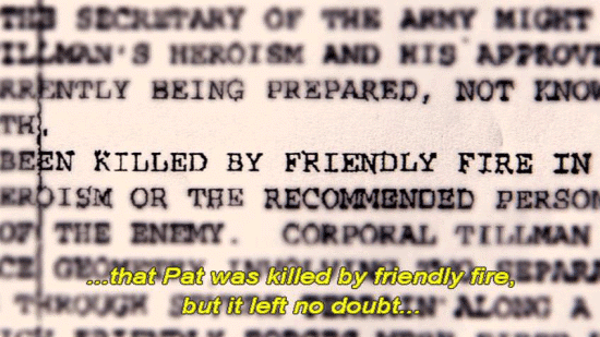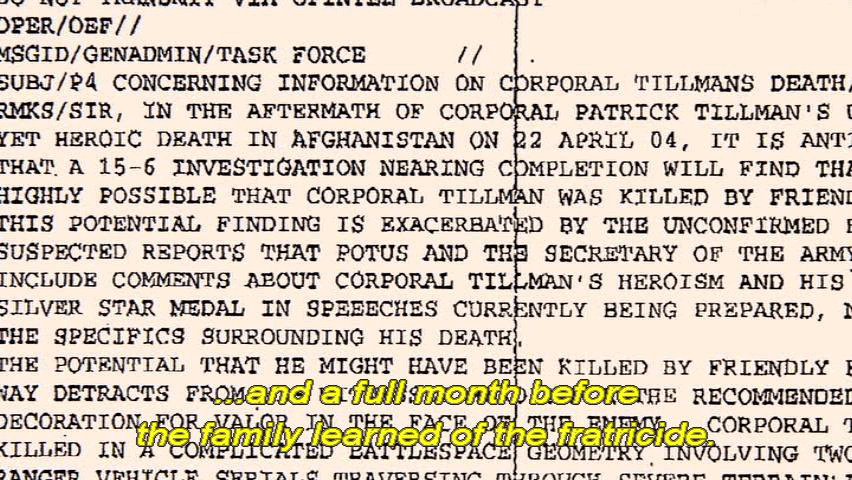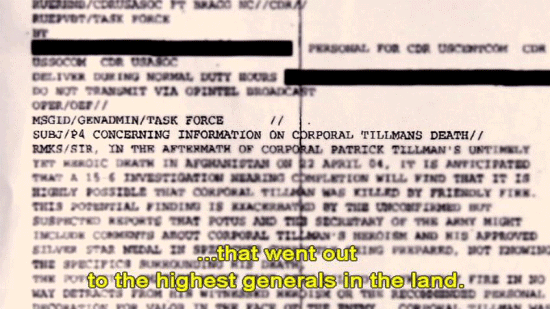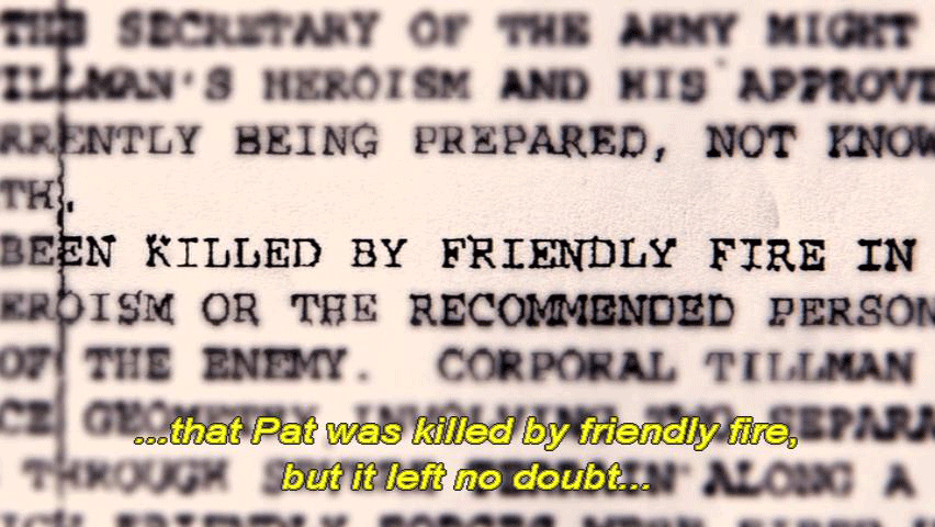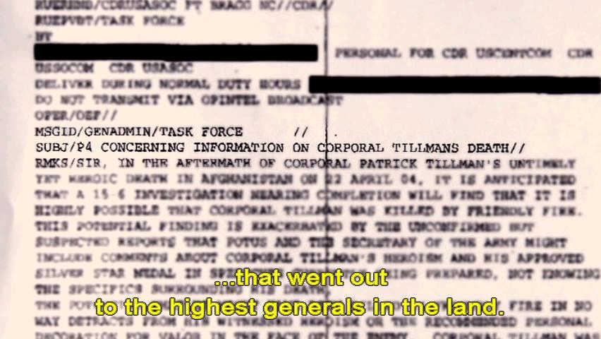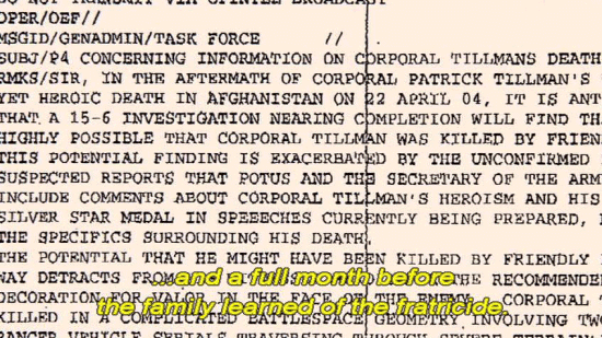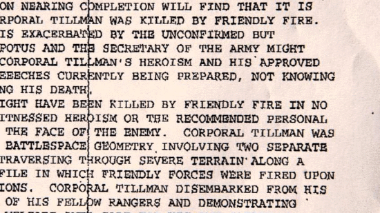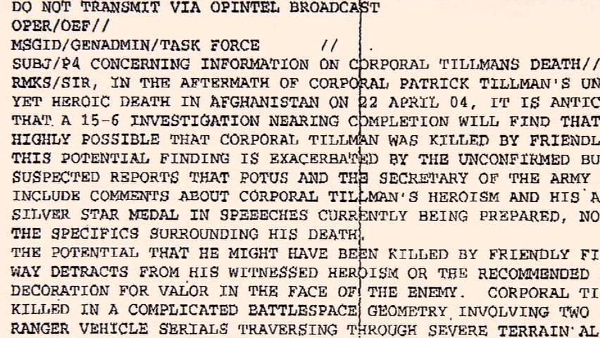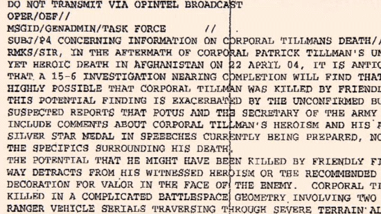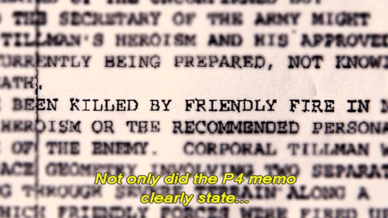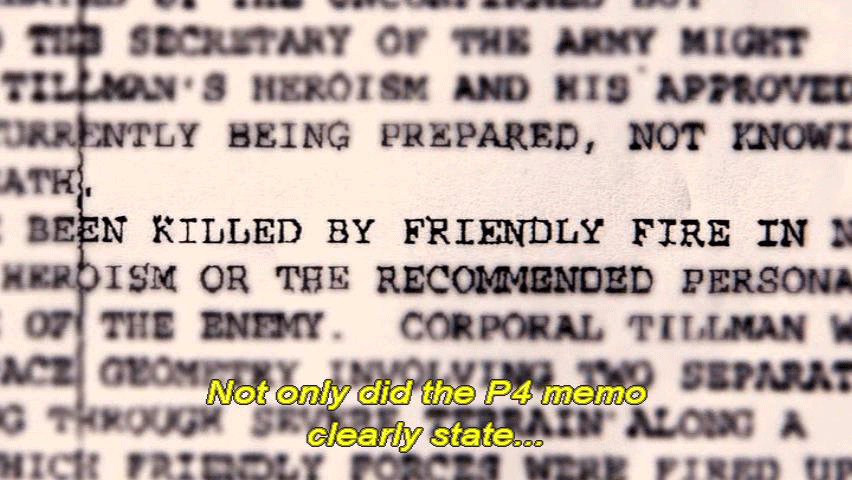 ... and a full month before the family learned of the fratricide. [Mary Tillman] After this briefing that we received from the inspector general ... ... someone from Associated Press was sent a P4 memo ... ... that went out to the highest generals in the land. [Narrator] Not only did the P4 memo clearly state ... ... that Pat was killed by friendly fire, but it left no doubt ... |