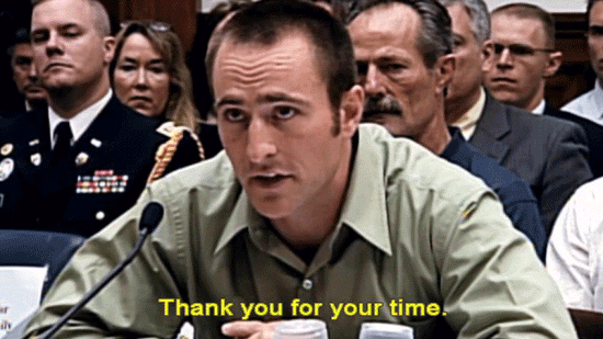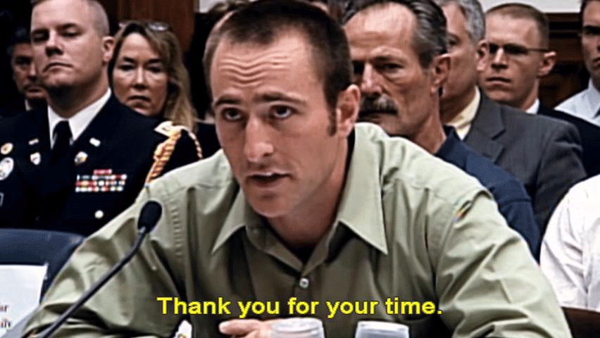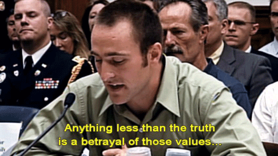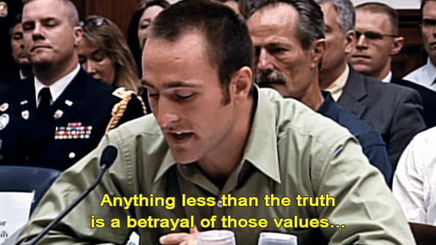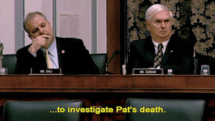 That is why we ask Congress ... ... as a sovereign representative of the whole people ... ... to investigate Pat's death. Anything less than the truth is a betrayal of those values ... ... that all soldiers who have fought for this nation have sought to uphold. Thank you for your time. |