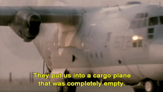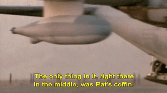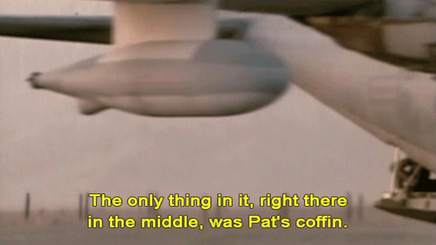 And I -- You know, I said, okay. Yeah. They put us into a cargo plane that was completely empty. The only thing in it, right there in the middle, was Pat's coffin. And they covered it with an American flag. Just sitting across from Kevin and looking at him, I couldn't say anything. |