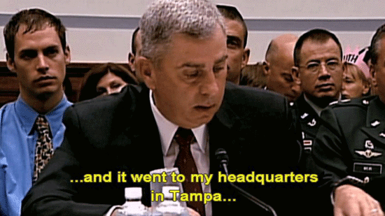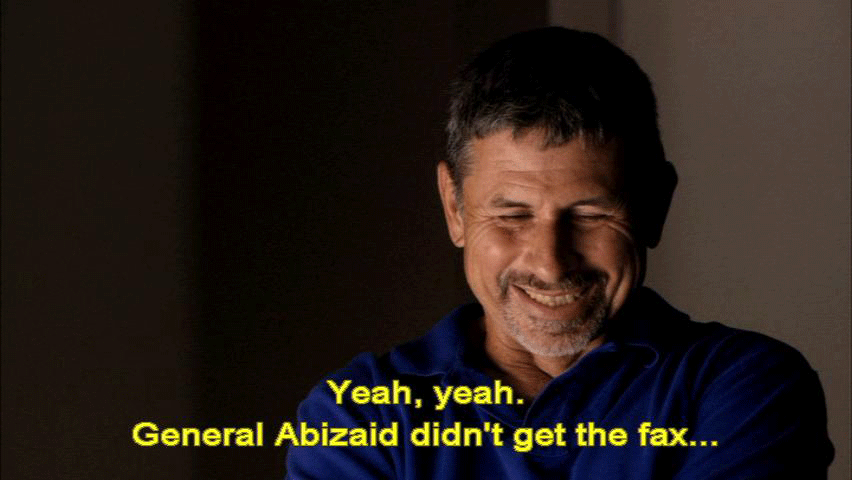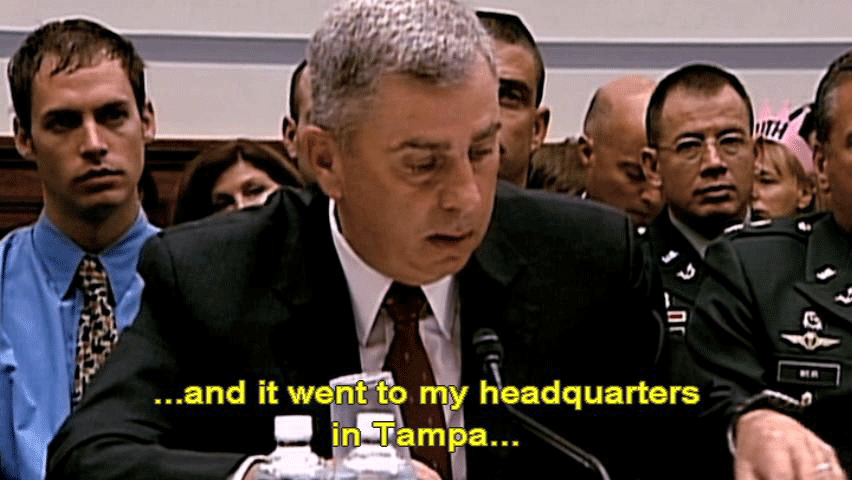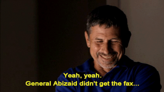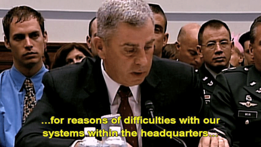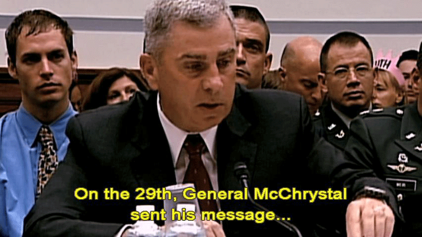 [U.S. Cent Com General John P. Abizaid] On the 29th, General McChrystal sent his message ... ... and it went to my headquarters in Tampa ... ... and it was not retransmitted ... ... for reasons of difficulties with our systems within the headquarters ... ... until the 6th at the earliest -- [Stan Goff, Retired soldier] Yeah, yeah. General Abizaid didn't get the fax ... |