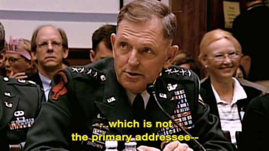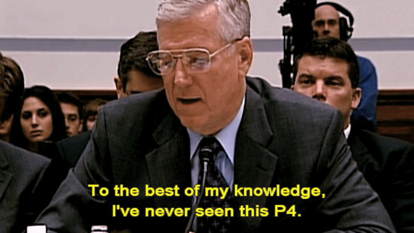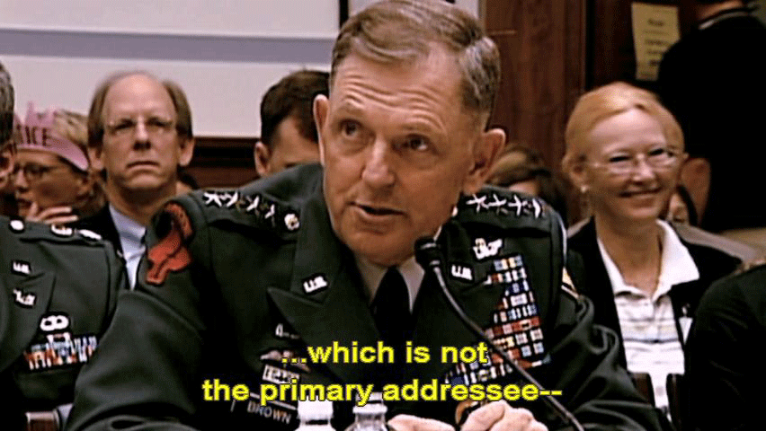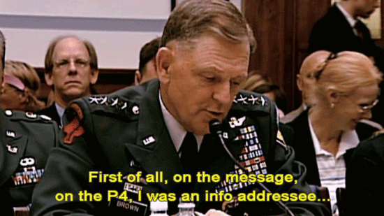 [Former Chairman Joint Chiefs General Richard Myers, Retired] I can't tell you. I don't know how I knew. To the best of my knowledge, I've never seen this P4. [General Bryan Brown] First of all, on the message, on the P4, I was an info addressee ... ... which is not the primary addressee -- [Narrator] In the next three hours, the committee would hear ... |