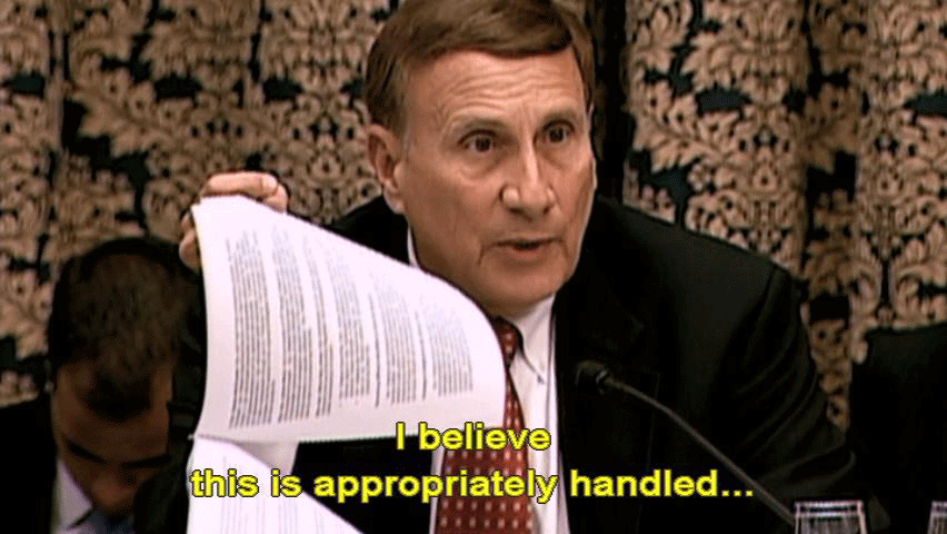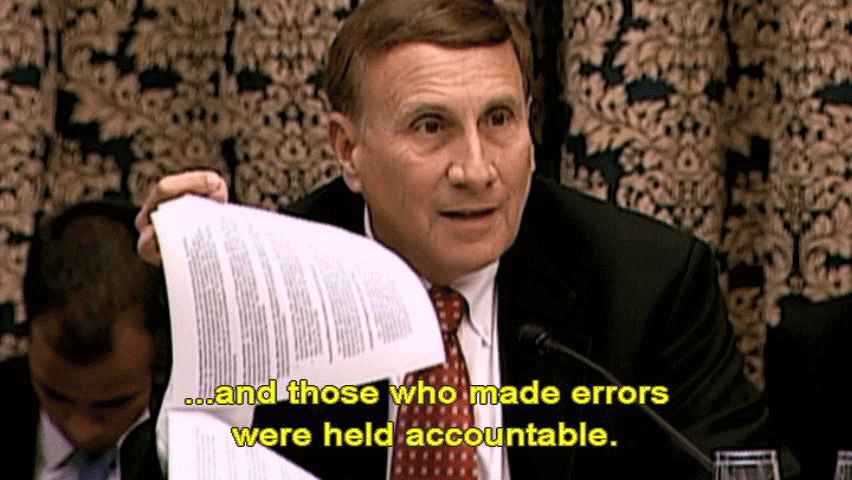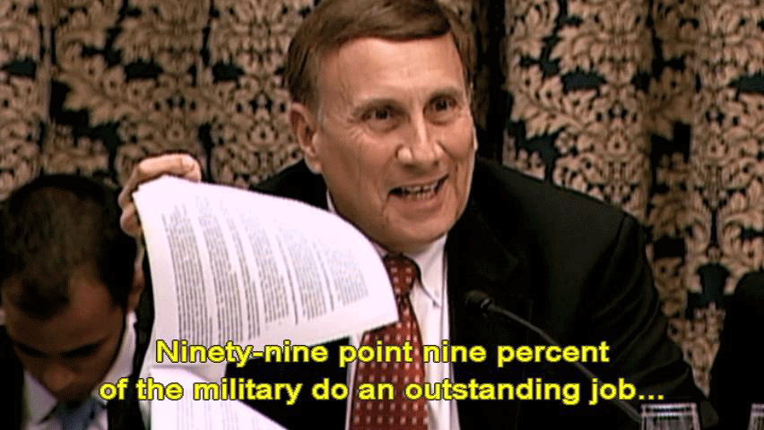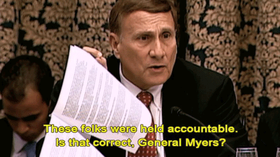 It's not a cheerleading outfit. [Rep. John L. Mica] I believe this is appropriately handled ... ... and those who made errors were held accountable. Ninety-nine point nine percent of the military do an outstanding job ... ... and I thank you for setting an example. These folks were held accountable. Is that correct, General Myers? |