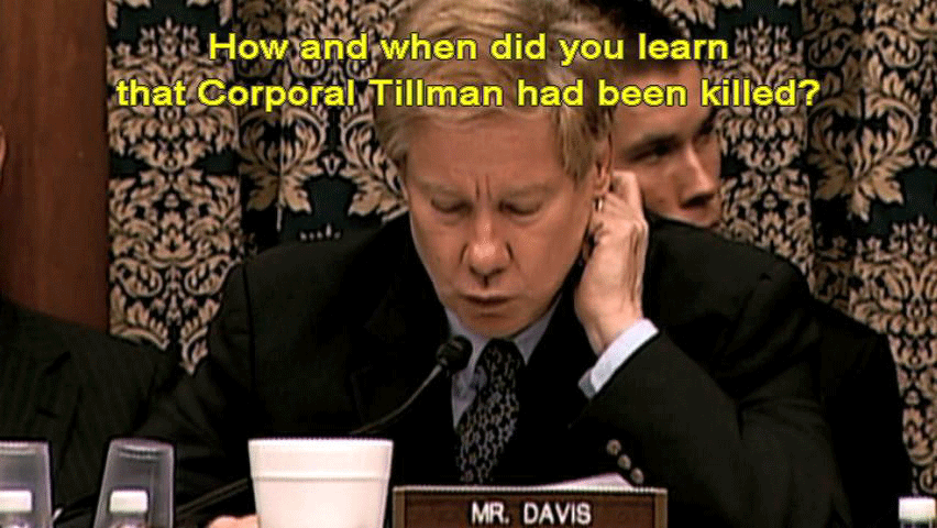 General? All generals? [General] From what I understand, that's correct. [Stan Goff, Retired soldier] You know, a lot of politics is theatrical wrestling, you know ... ... which, behind the scenes it's like, "Okay, let's don't get anybody hurt." [Rep. Tom Davis] Mr. Secretary, thank you for being with us today. How and when did you learn that Corporal Tillman had been killed? |