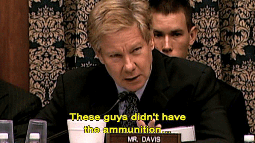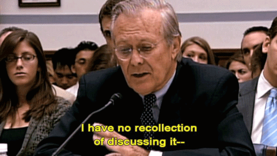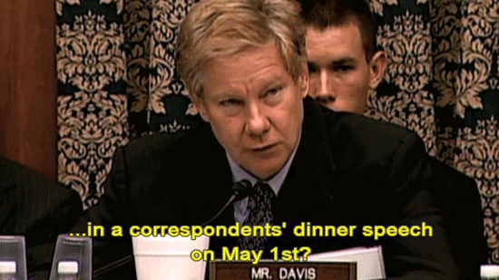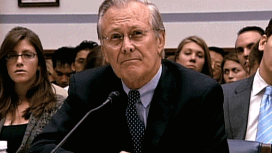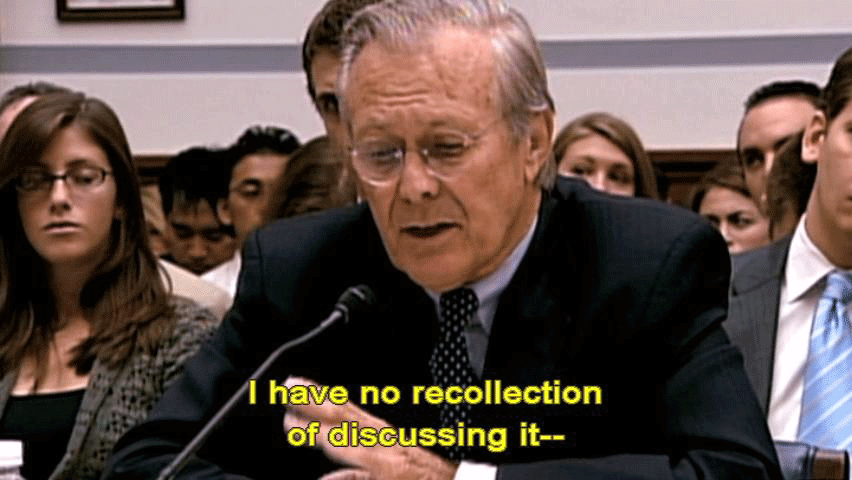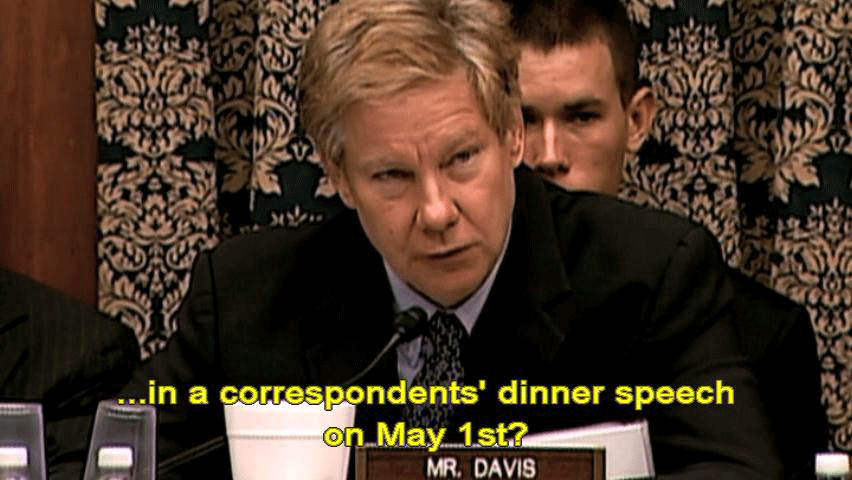 ... in a correspondents' dinner speech on May 1st? [Donald Rumsfeld] No. [Patrick Tillman Sr., Pat's father] It was embarrassing to watch. [Donald Rumsfeld] I have no recollection of discussing it -- [Patrick Tillman Sr., Pat's father] These guys didn't have the ammunition ... ... to cross-examine him and catch him in a lie. [Rep. Henry Waxman] Well, let me conclude the hearing by just indicating the facts ... |