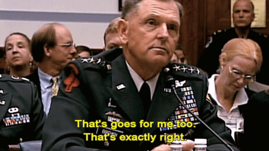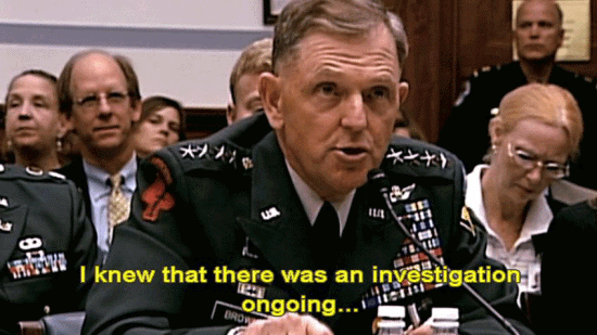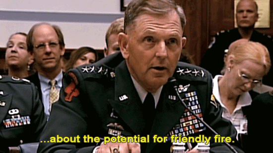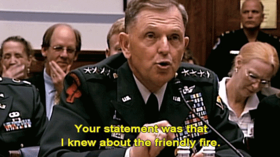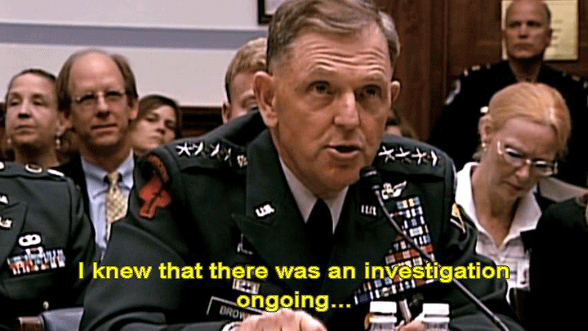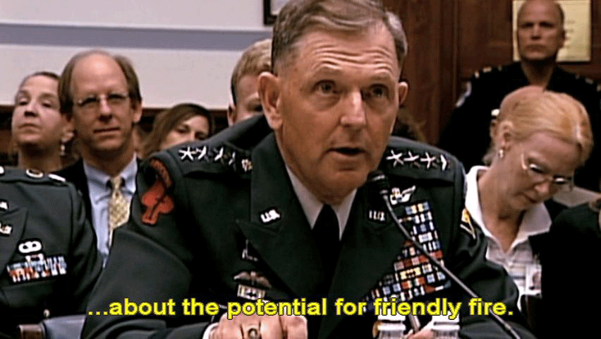 [Rep. Henry Waxman] Well, you were all very busy. There was no question about it. [General Bryan Brown] Sir, one other thing, if I could interrupt to also correct. Your statement was that I knew about the friendly fire. I knew that there was an investigation ongoing ... ... about the potential for friendly fire. [Former Chairman Joint Chiefs General Richard Myers, Retired] That goes for me too. That's exactly right. [U.S. Cent Com General John P. Abizaid] And for me, as well. [Rep. Henry Waxman] Okay. [Stan Goff, Retired soldier] At the point that they let Abizaid off the hook ... |
