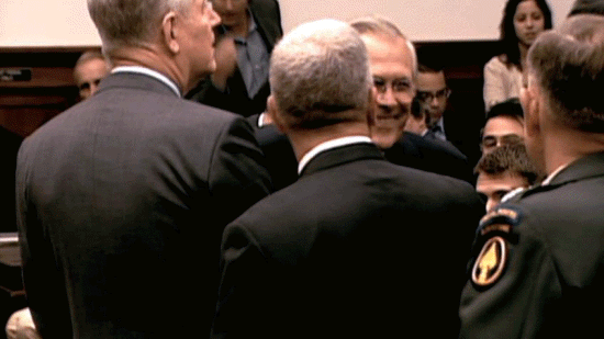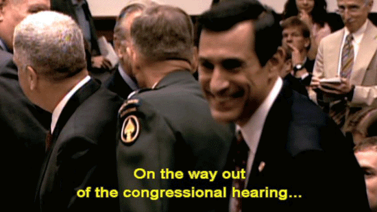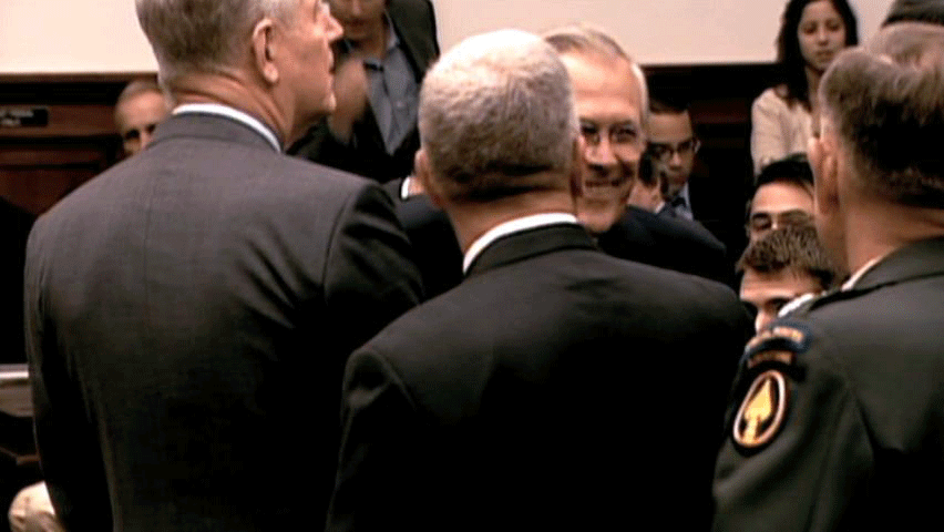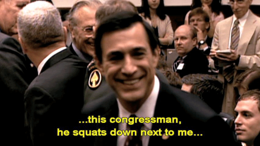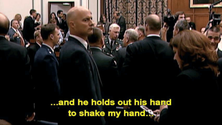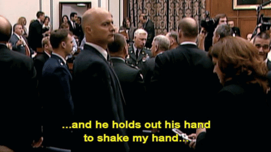 [Patrick Tillman Sr., Pat's father] On the way out of the congressional hearing ... ... this congressman, he squats down next to me ... ... and he holds out his hand to shake my hand ... ... and he just wanted to tell me that he's proud of me ... ... and he's proud of my son. I just said, "Get out of here. Get away from me." He would not go away, he wanted to keep talking. |