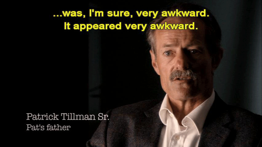 ... was, I'm sure, very awkward. It appeared very awkward. At the time, it seemed that he was still very upset ... ... and rattled by the whole setting, and Pat's death ... ... because he liked Pat a lot. [Pfc. Russell Baer, 2/75 Ranger Battalion] I went into Pat's mom's living room and I gave them my narrative ... ... excluding certain possibilities. [Patrick Tillman Sr., Pat's father] And Russell Baer told us nothing. |
