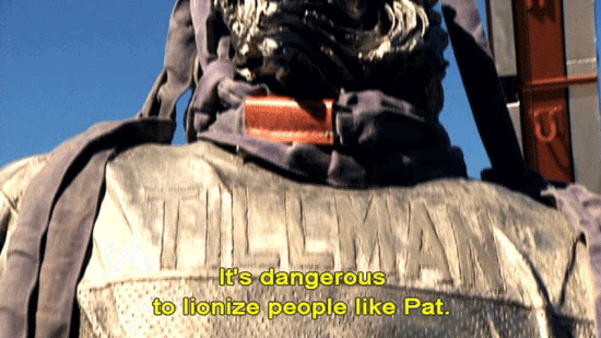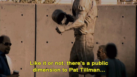 [Stan Goff, Retired soldier] The be all and the end all ... ... is not whether or not Congress follows through. Like it or not, there's a public dimension to Pat Tillman ... ... and it ain't gonna go away. That's a dangerous thing to fool around with, though. It's dangerous to lionize people like Pat. |
