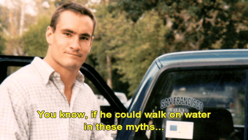 You wanna make him a myth? Go ahead and make him a myth, just be accurate with it. You know, if he could walk on water in these myths ... ... then let him have a beer every once in a while ... ... and let him hang out with friends and let him be gracious ... ... and let him be sensitive and let him be funny ... |