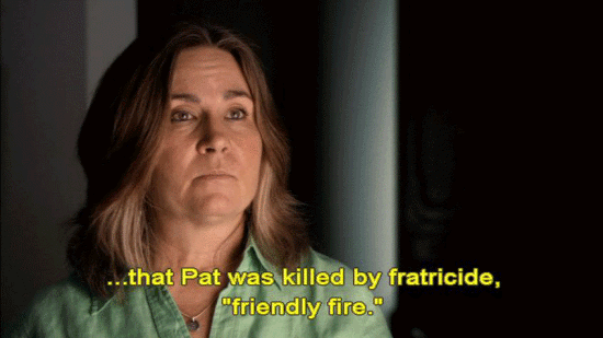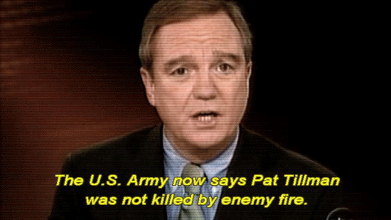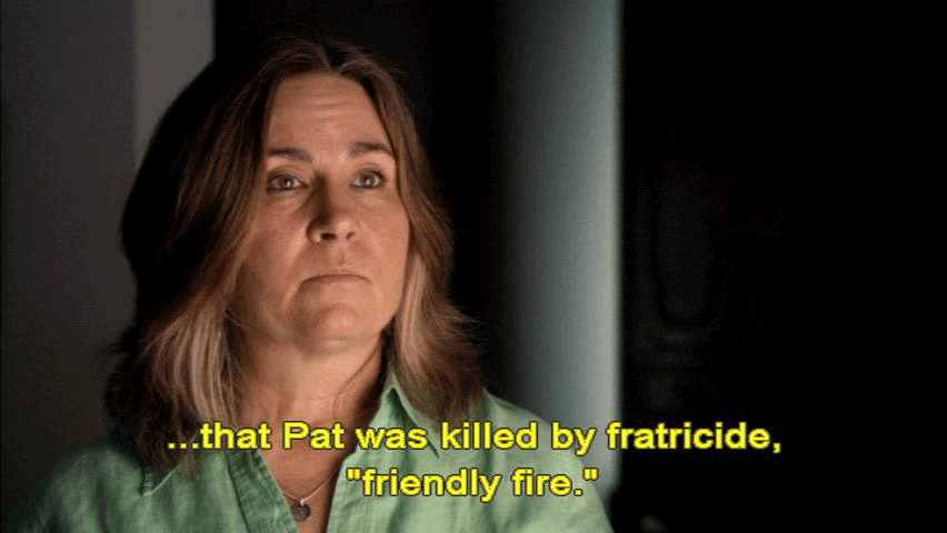 And I just got a very eerie feeling, and when I called him back ... ... he asked me what I thought about the news the Army had given us ... ... and I didn't know what he was talking about. So I basically prodded him to tell me ... ... and he said that, you know, there was a suspicion ... ... that Pat was killed by fratricide, "friendly fire." [Newscaster 5] The U.S. Army now says Pat Tillman was not killed by enemy fire. |