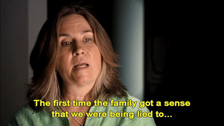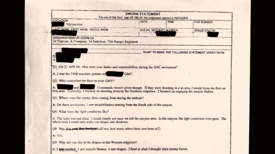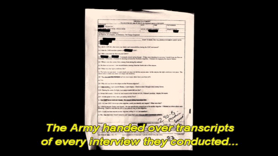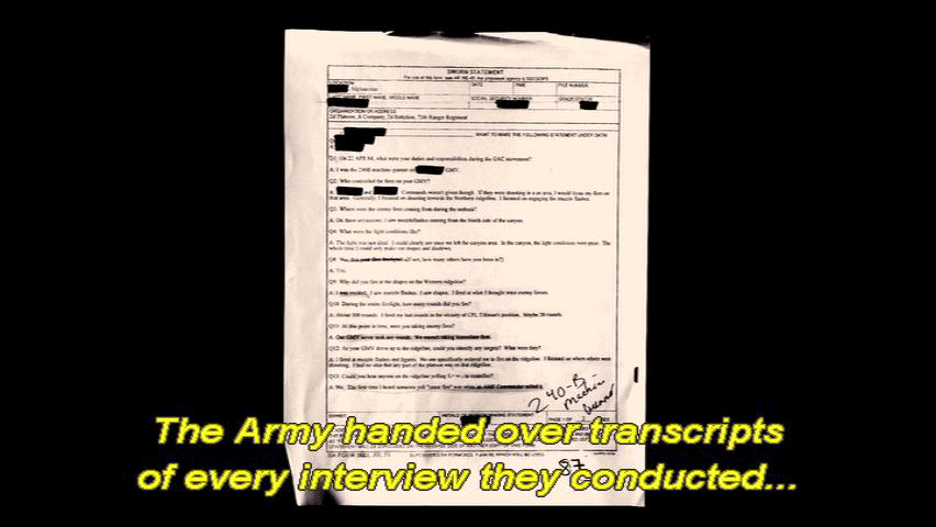 [Mary Tillman] The first time the family got a sense that we were being lied to ... ... was when we started looking at the documents. [Stan Goff, Retired soldier] They gave her the papers, but what they did was ... ... I think, they tried to drown her, you know. They wanted to give her so much that, you know, no normal human being ... ... would dig through all this paperwork and try to make sense out of it. [Narrator] The Army handed over transcripts of every interview they conducted ... |