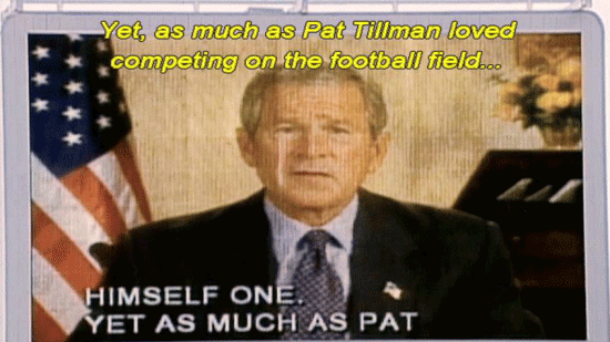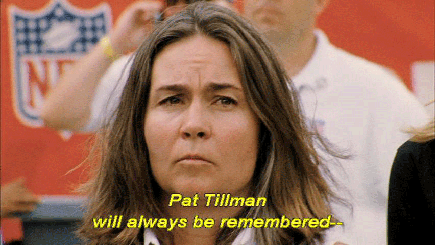 [George Bush] Pat Tillman loved the game of football. Yet, as much as Pat Tillman loved competing on the football field ... he loved America even more. Courageous and humble, a loving husband and son ... a devoted brother and a fierce defender of liberty. Pat Tillman will always be remembered -- |