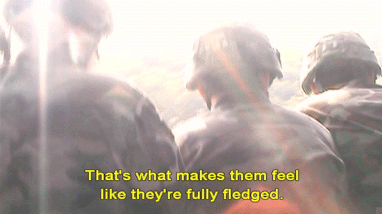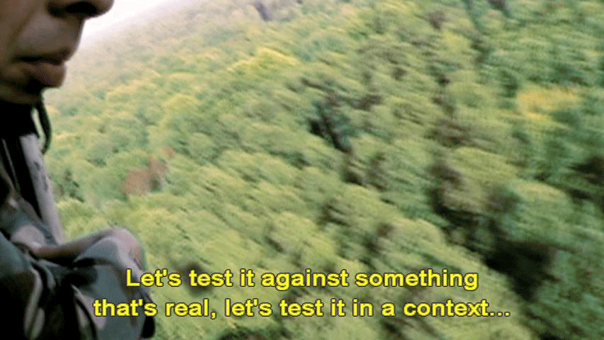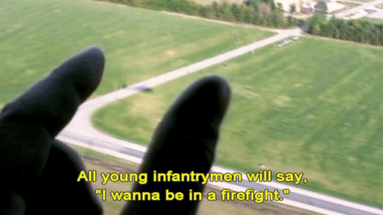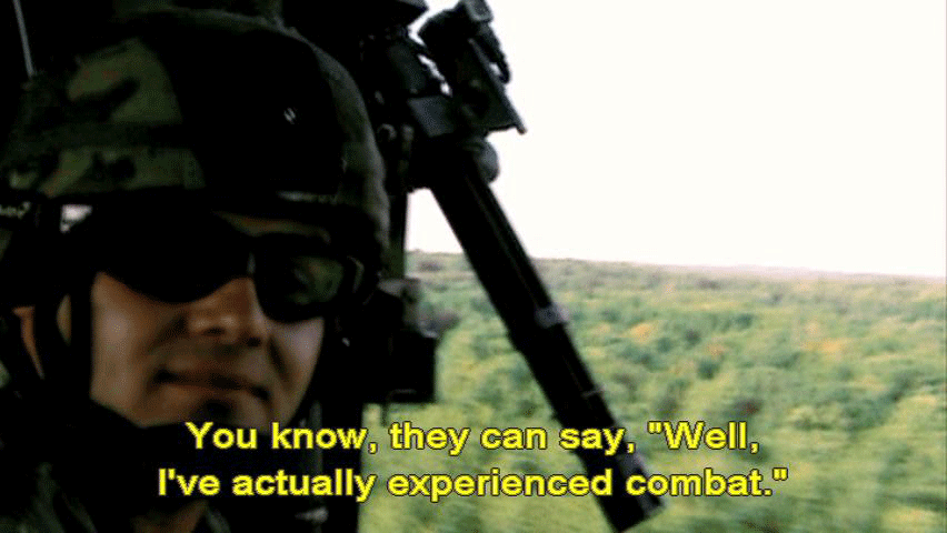 Let's test it against something that's real, let's test it in a context ... ... where life and death are real coexisting possibilities. All young infantrymen will say, "I wanna be in a firefight." That's what makes them feel like they're fully fledged. You know, they can say, "Well, I've actually experienced combat." |
