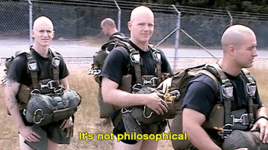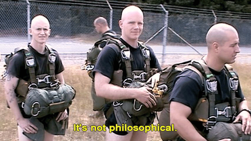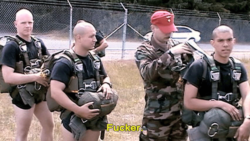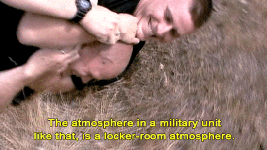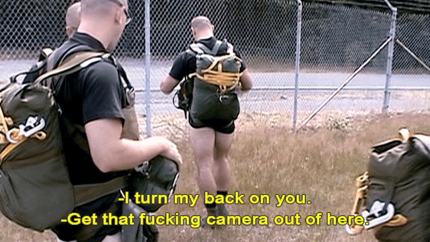 The atmosphere in a military unit like that, is a locker-room atmosphere. [Ranger] Tapping. [Ranger] Fucker. [Stan Goff, Retired soldier] It's not philosophical. [Ranger] I turn my back on you. [Ranger] Get that fucking camera out of here. |