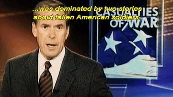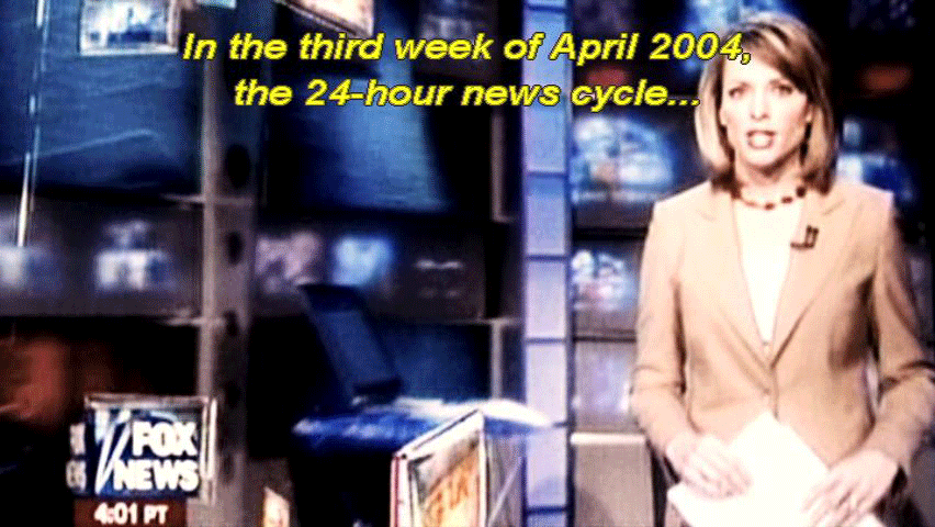 [Newscaster 2] Our top story -- [Newscaster 3] On a more serious and indeed, tragic note -- [Reporter] Live fire rounds all around me -- [Neil Young: Hawks Doves Lyrics] In history we painted pictures grim ... [Narrator] In the third week of April 2004, the 24-hour news cycle ... ... was dominated by two stories about fallen American soldiers. |