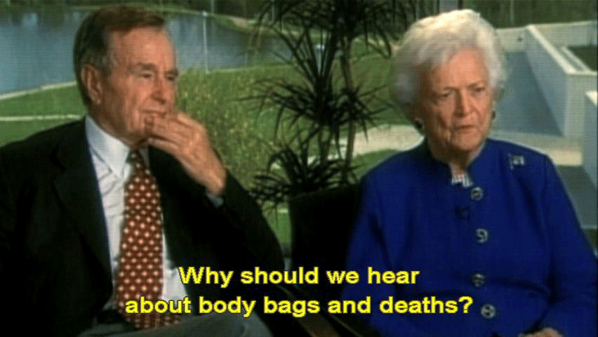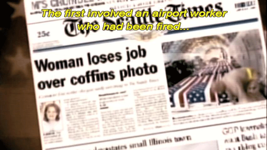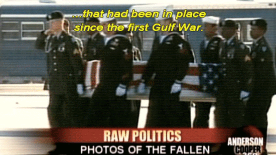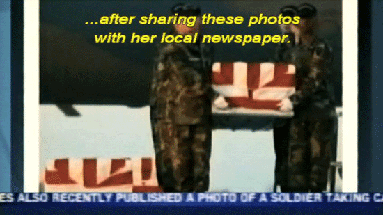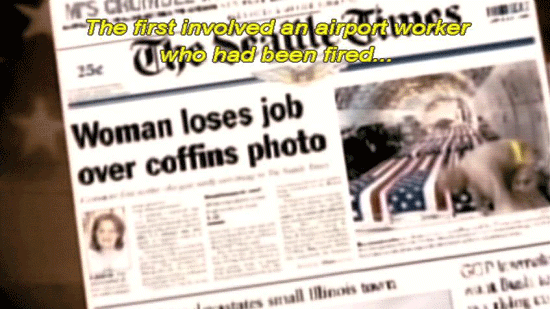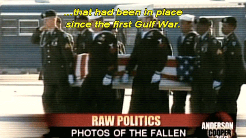 The first involved an airport worker who had been fired ... ... after sharing these photos with her local newspaper. This sparked debate about a federal law ... ... that had been in place since the first Gulf War. [Barbara Bush] Why should we hear about body bags and deaths? |