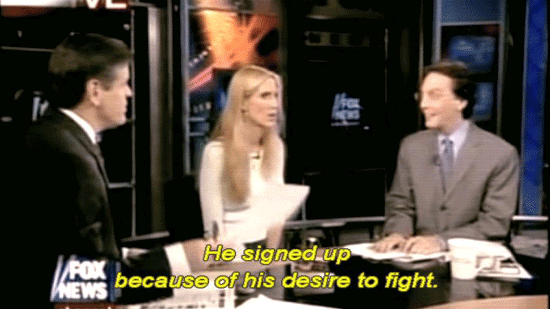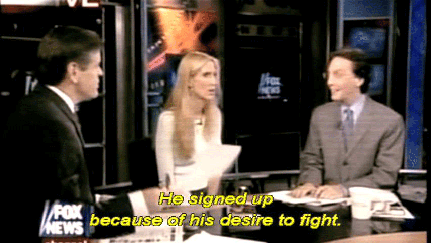 ... was gonna vote for John Kerry, was against the war in Iraq. [Ann Coulter] I REALLY don't believe it. [Sean Hannity] I don't believe it either. He signed up because of his desire to fight. [Marie Tillman, Pat's wife] They would take parts of who he was ... ... and magnify those to suit their purposes. |