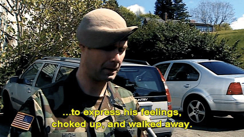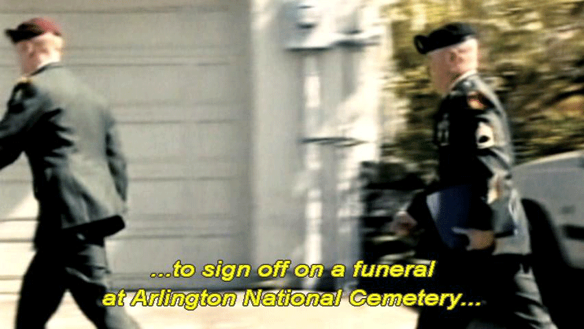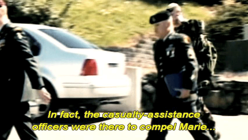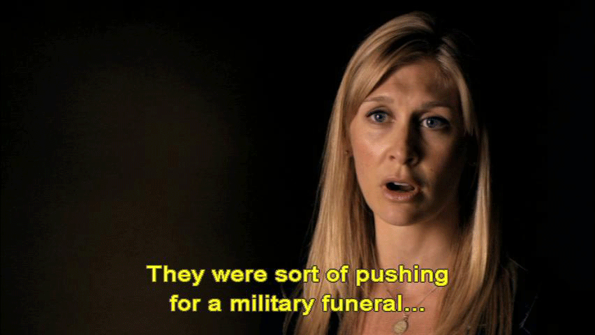 ... to express his feelings, choked up, and walked away. [Staff Sergeant David High, Ranger] No, that's not good. Sorry. [Narrator] But the newsmen camped out on Marie's lawn had the story wrong. In fact, the casualty assistance officers were there to compel Marie ... ... to sign off on a funeral at Arlington National Cemetery ... ... with full military honors. [Marie Tillman, Pat's wife] They were sort of pushing for a military funeral ... ... which was not what his wishes were. |
