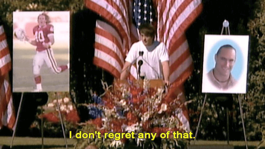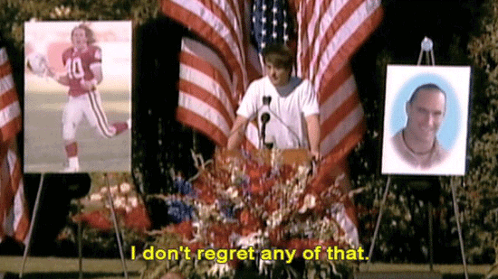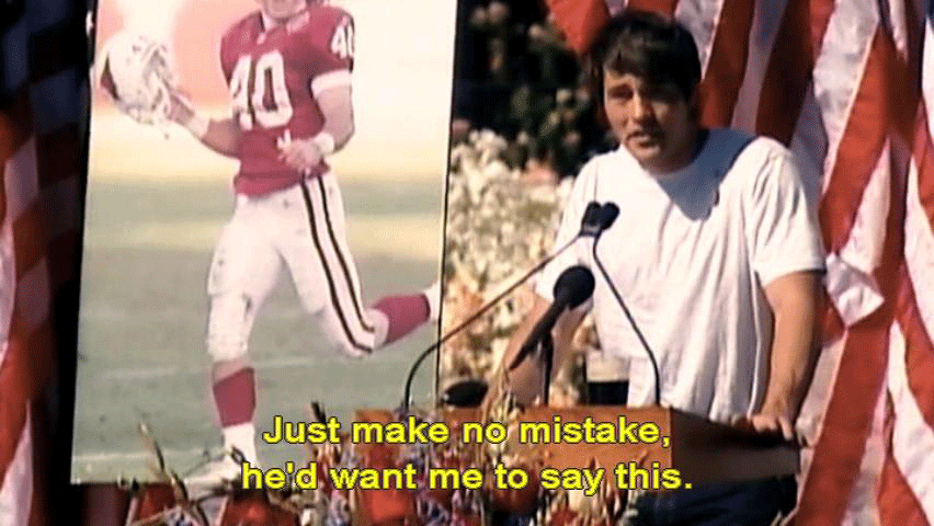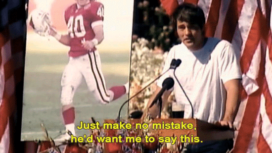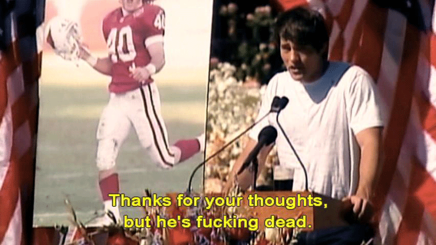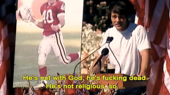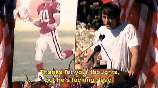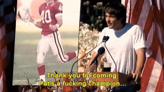 Thank you for coming. Pat's a fucking champion ... ... and always will be. Just make no mistake, he'd want me to say this. He's not with God, he's fucking dead. He's not religious, so ... Thanks for your thoughts, but he's fucking dead. I don't regret any of that. |